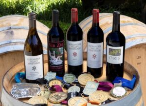 AVV Core Wines displayed with numerous award medals on wine barrel