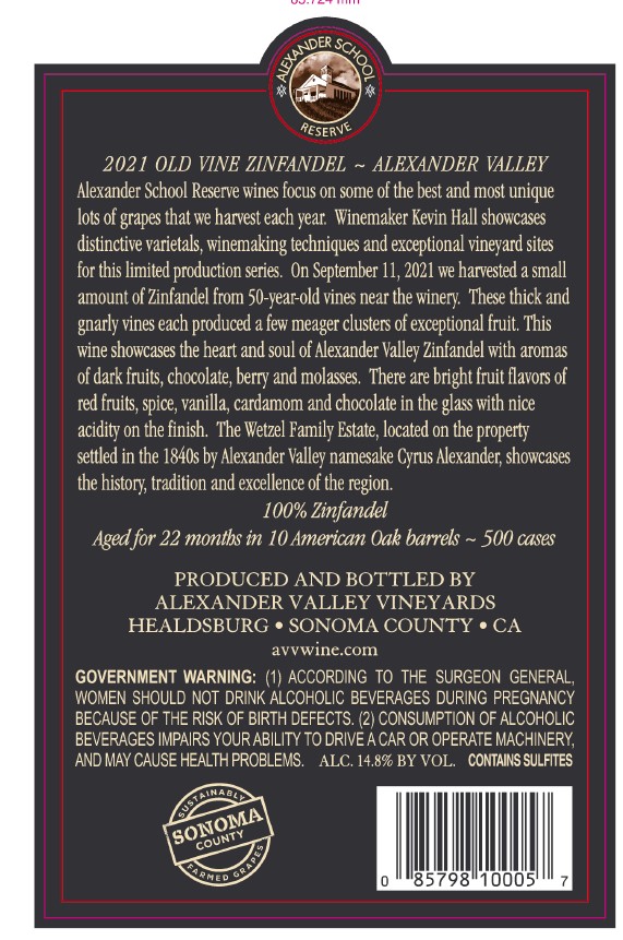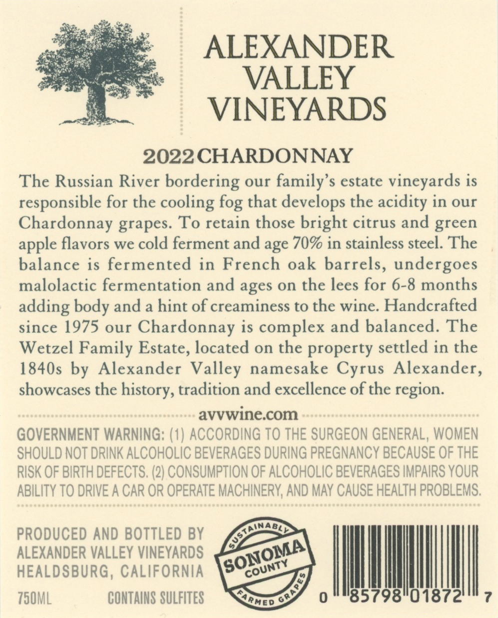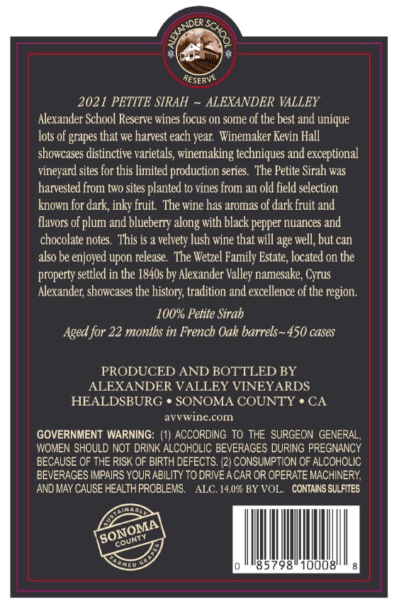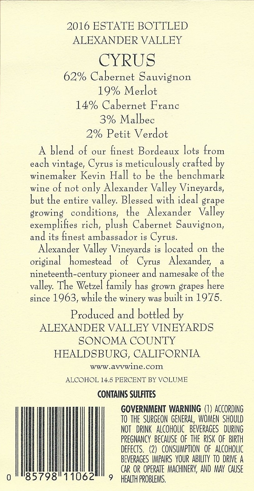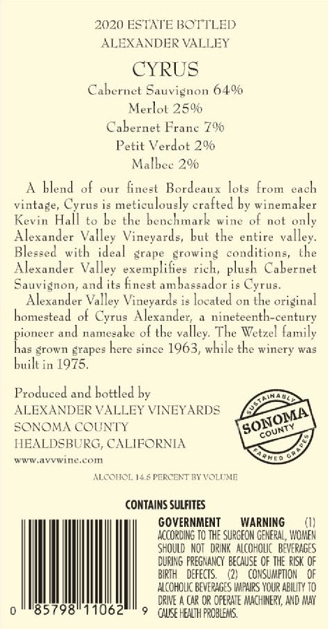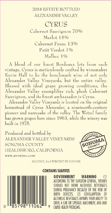 Product Information WhiteChardonnay 2023 750ml Fact Sheet Bottle Shots: 750ml Front Bottle Shot 750ml Back Bottle Shot Labels: 750ml Front Label 750ml Back Label Tasting Panel - 92 points 2022 750ml Fact Sheet Bottle Shots: 750ml Front Bottle Shot 750ml Back Bottle Shot Labels: 750ml Front Label 750ml Back Label Shelf Talkers: California State Fair - 95 points Decanter World Wine Awards - 92 points Wine Enthusiast - 91 points Press Democrat North Coast Wine Challenge - 91 points Casecard: Wine Enthusiast 91 Points 2021 750ml Fact Sheet Bottle Shots: 750ml Front Bottle Shot 750ml Back Bottle Shot Labels: 750ml Front Label 750ml Back Label Shelf Talkers: California State Fair - 99 points & Double Gold Medal Sunset International Competition - 97 points & Best of Class Beverage Testing Institute - 96 points Tasting Panel Magazine - 94 points Sonoma County Harvest Fair - Double Gold Medal 2020 750ml Fact Sheet Bottle Shots: 750ml Front Bottle Shot 750ml Back Bottle Shot Labels: 750ml Front Label 750ml Back Label Shelf Talkers: Beverage Dynamics 96 points Sunset Intl Wine Competition 95 points California State Fair 91 points Hilton Head - Gold Medal Gewürz - organically grown 2024 750ml Fact Sheet Bottle Shots: 750ml Front Bottle Shot 750ml Back Bottle Shot Labels: 750ml Front Label 750ml Back Label 2023 750ml Fact Sheet Bottle Shots: 750ml Front Bottle Shot 750ml Back Bottle Shot Labels: 750ml Front Label 750ml Back Label Shelf Talkers: California State Fair - 99 points Sunset International Wine Competition - 92 points & Gold Medal Beverage Testing Institute - 90 points & Gold Medal AVV 2023 Gewurz tasting and pairing 2022 750ml Fact Sheet Bottle Shots: 750ml Front Bottle Shot 750ml Back Bottle Shot Labels: 750ml Front Label 750ml Back Label CCOF Certification 2021 750ml Fact Sheet Bottle Shots: 750ml Front Bottle Shot 750ml Back Bottle Shot 750ml Front Label Shelftalker: Sunset Intl Wine Competition - 92 points Sauvignon Blanc 2024 750ml Fact Sheet Bottle Shots: 750ml Front Bottle Shot 750ml Back Bottle Shot Labels: 750ml Front Label 750ml Back Label 2023 750ml Fact Sheet Bottle Shots: 750ml Front Bottle Shot 750ml Back Bottle Shot Labels: 750ml Front Label 750ml Back Label Shelf Talkers: The Tasting Panel - 92 points 2022 750ml Fact Sheet Bottle Shots: 750ml Front Bottle Shot 750ml Back Bottle Shot Labels: 750ml Front Label 750ml Back Label Shelf Talkers: California State Fair - 95 points & Gold Medal Tasting Panel Magazine - 92 points SASSR - Gold Medal 2021 750ml Fact Sheet Bottle Shots: 750ml Front Bottle Shot 750ml Back Bottle Shot Labels: 750ml Front Label 750ml Back Label Shelf Talkers: CA State Fair - 99 points RoséDry Rosé of Sangiovese 2024 Fact Sheets: 750ml Fact Sheet Keg Fact Sheet Bottle Shots: 750ml Front Bottle Shot 750ml Back Bottle Shot Labels: 750ml Front Label 750ml Back Label Keg Collar Tap Handle 2023 750ml Fact Sheet Bottle Shots: 750ml Front Bottle Shot 750ml Back Bottle Shot Labels: 750ml Front Label 750ml Back Label Shelf Talkers: James Suckling - 90 points 2022 750ml Fact Sheet Bottle Shots: 750ml Front Bottle Shot 750ml Back Bottle Shot Labels: 750ml Front Label 750ml Back Label Shelf Talkers: California State Fair - 99 points Wine Enthusiast “Hidden Gem” - 90 points Beverage Dynamics - 95 points Beverage Testing Institute - 93 points Sunset International Wine Competition - 92 points Sonoma County Harvest Fair - Double Gold Medal SASSR - Top of Class TexSom - Judges' Selection, Best of Show Varietal 2021 750ml Fact Sheet Bottle Shots: 750ml Front Bottle Shot 750ml Back Bottle Shot Labels: 750ml Front Label 750ml Back Label Shelf Talkers: CA State Fair - 99 points Sunset Intl Wine Competition - 92 points 2020 750ml Fact Sheet 750ml Bottle Shot Labels: 750ml Front Label 750ml Back Label Shelf Talkers: Rose' Experience - Best of Class Sunset International Wine Competition - 92 points Sonoma County Harvest Fair - Double Gold Medal RedCYRUS 2021 750ml Fact Sheet Bottle Shots: 750ml Front Bottle Shot 750ml Back Bottle Shot Labels: 750ml Front Label 750ml Back Label 2020 750ml Fact Sheet Bottle Shots: 750ml Front Bottle Shot 750ml Back Bottle Shot Labels: 750ml Front Label 750ml Back Label Shelf Talkers: The Tasting Panel - 95 points Wine Enthusiast - 92 points 2019 750ml Fact Sheet Bottle Shots: 750ml Front Bottle Shot 750ml Back Bottle Shot Labels: 750ml Front Label 750ml Back Label 2018 750ml Fact Sheet Bottle Shots: 750ml Front Bottle Shot 750ml Back Bottle Shot Labels: 750ml Front Label 750ml Back Label 2017 Fact Sheets: 750ml Fact Sheet 3.0L Fact Sheet Bottle Shots: 750ml Bottle Shot 3.0L Bottle Shot Labels: 750ml Front Label 750ml Back Label Shelf Talkers: The Somm Journal - 98 points Beverage Dynamics 98 points Wine Enthusiast - 95 points James Suckling - 92 points The Somm Journal - 98 points 2016 Fact Sheets: 750ml Fact Sheet 1.5L Fact Sheet 3.0L Fact Sheet Bottle Shots: 750ml Bottle Shot 1.5L Bottle Shot 3.0L Bottle Shot Labels: 750ml Front Label 750ml Back Label Shelf Talkers: LA Invitational Wine Challenge - 96 points 93 Points - BTI SF Chronicle - Double Gold Hilton Head - Double Gold 2015 750ml Fact Sheet Bottle Shots: 750ml Bottle Shot 3.0L Bottle Shot Labels: 750ml Front Label 750ml Back Label Shelf Talkers: London Wine Competition - 94 points Decanter Wine Awards - 93 points BTI - 92 points Wine & Spirits - 91 points North of the Gate - Double Gold Medal SASSR - Double Gold Medal TexSom Intl Wine Awards - Gold Medal HLSR - Gold Medal Hilton Head - Best of Show 2015-2017 AVV Cyrus Three Vintage Vertical Fact Sheet 2014 750ml Fact Sheet 750ml Bottle Shot Labels: 750ml Front Label 750ml Back Label Shelf Talkers: Grand Champion & Best of Show - Rodeo Uncorked! Houston Livestock Show & Rodeo Decanter World Wine Awards - 97 Points Beverage Dynamics - 92 points Wine Advocate - 91 points SARSS - Double Gold Case Card: Grand Champion and Best of Show – Rodeo Uncorked! Houston Livestock Show & Rodeo 2013 750ml Fact Sheet 750ml Bottle Shot 750ml Front Lab
