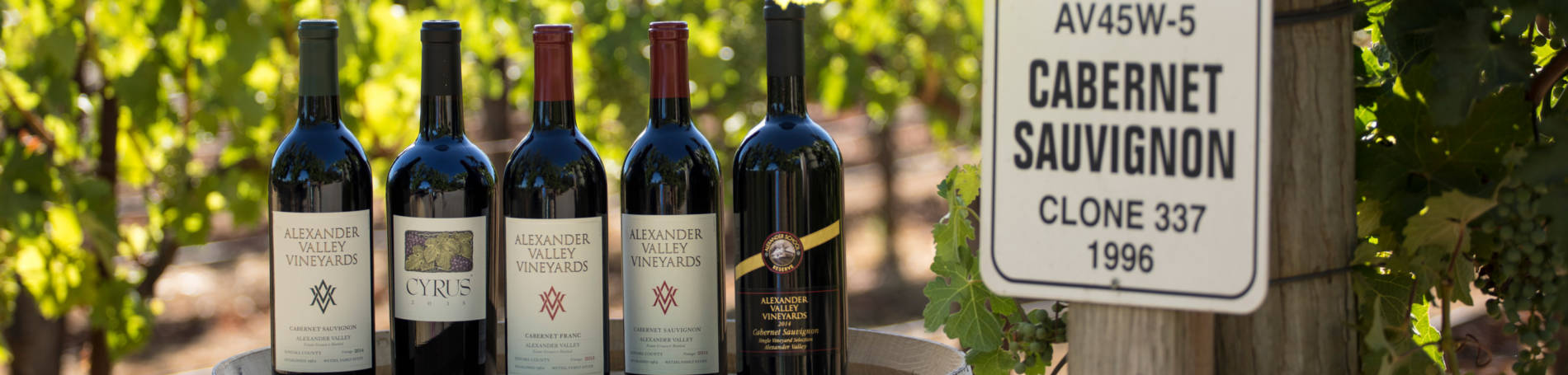 Bottle shot of Organic Cabernet Sauvignon, CYRUS, Cabernet Franc, Cabernet Sauvignon, Alexander School Reserve Cabernet Sauvignon sitting on a barrel out in a vineyard next to Cabernet Sauvignon sign