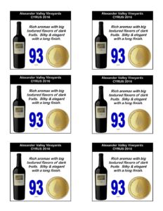 AVV 2016 CYRUS 93 BTI Shelf talker for AVV 2016 CYRUS. 93 points and gold medal from Beverage Testing Institute. 6 copies of image.