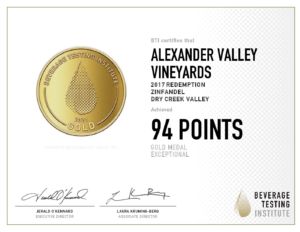 BTI-Certificate–2017-Redemption-Zinfandel-Dry-Creek-Valley-USA-01-18-2022-4916 Beverage Testing Institute certificate for AVV 2017 Redemption Zinfandel. 94 points and gold medal.