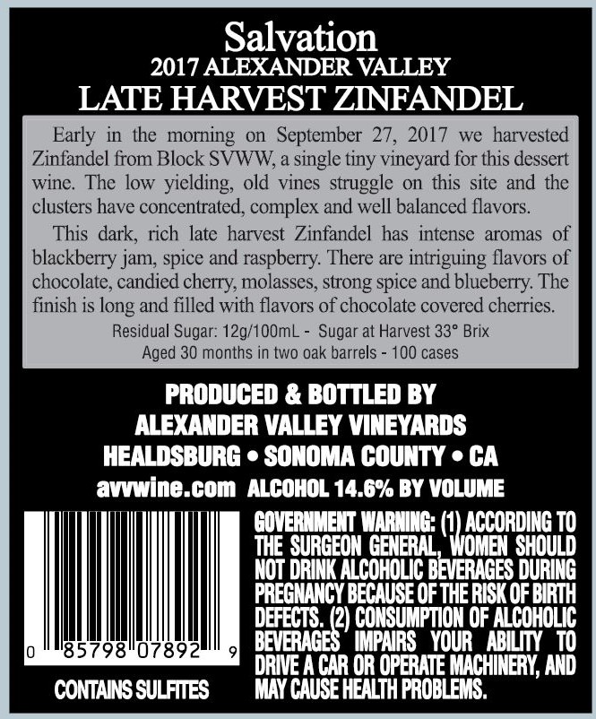 AVV Salvation Late Harvest Zinfandel 2017 back label