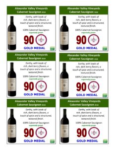 Shelf talker for AVV 2018 Cabernet Sauvignon – organically grown. 90 points and Gold medal from Sante International Wine and Spirits Competition. 6 copies of image.