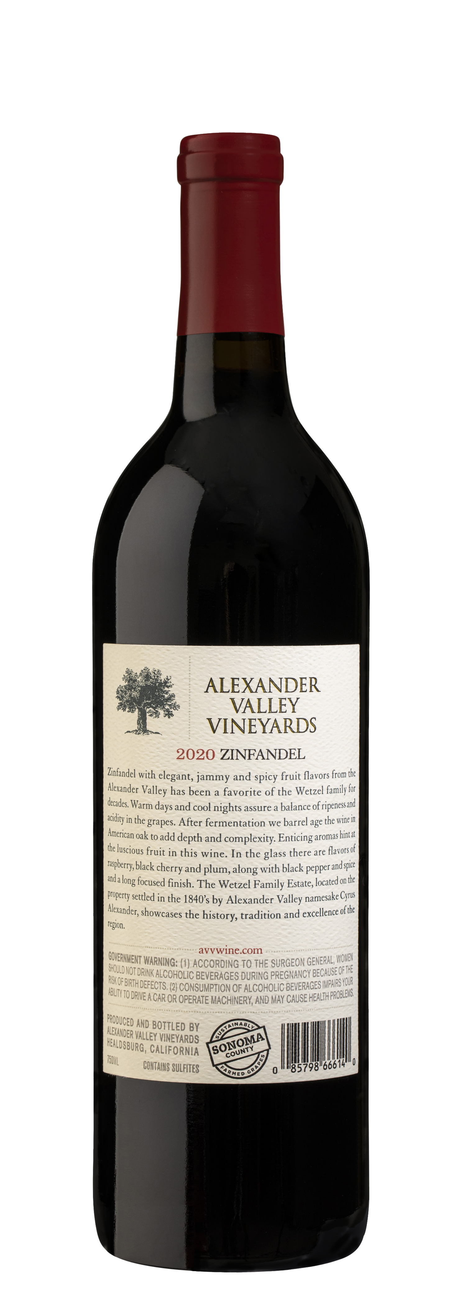 Back bottle shot of AVV Zinfandel. Vintage: 2020. Appellation: Alexander Valley.